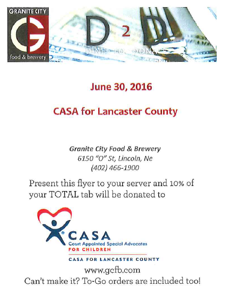 Dine at Granite City Food & Brewery on Thursday June 30th and 10% of your entire purchase will be donated to CASA for Lancaster County. This includes lunch dinner, beverages, and to-go orders!